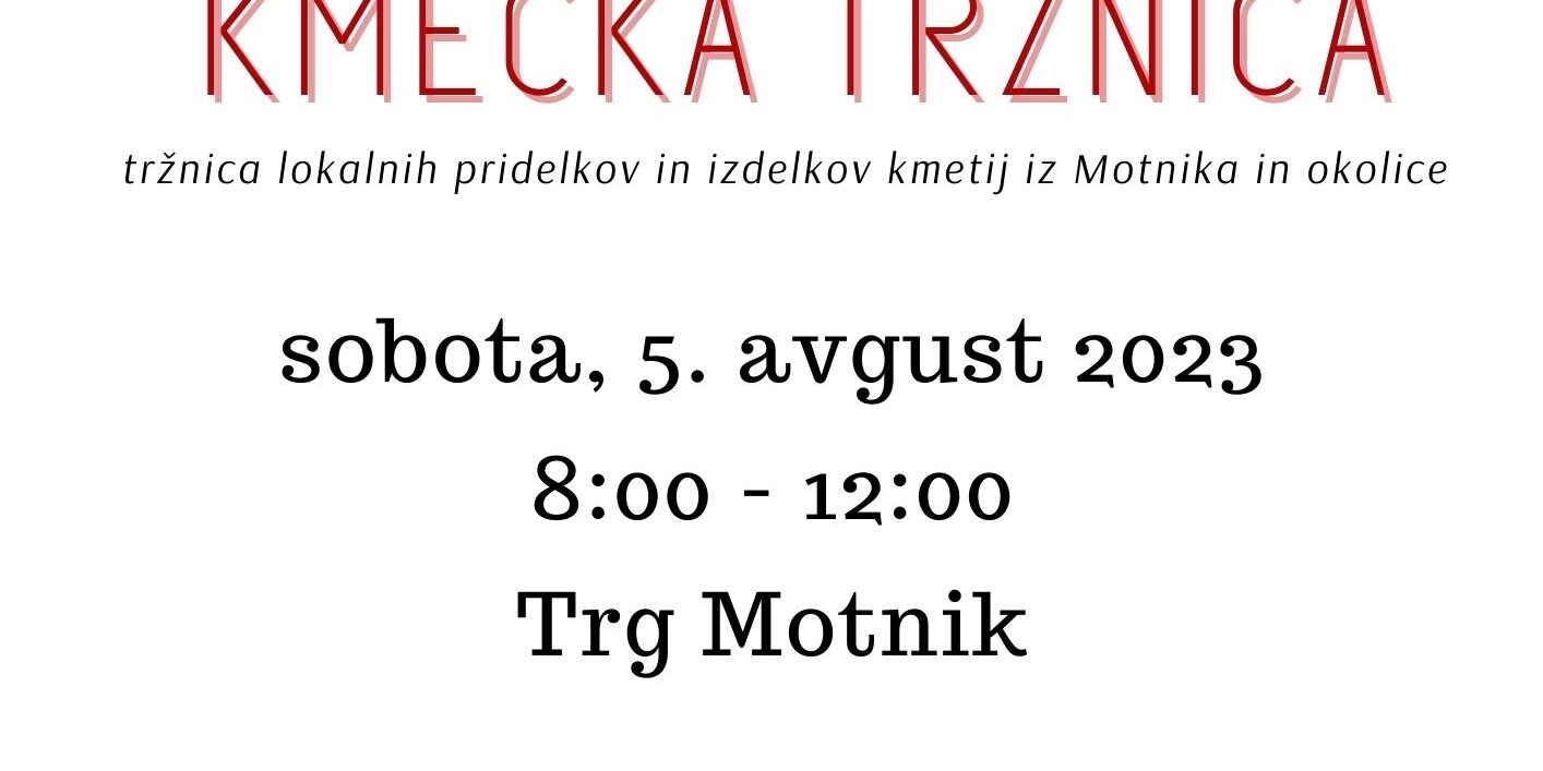 Jul312023V soboto, 4. avgusta bo ponovno potekala kmečka tržnica lokalnih dobrot. Vabljeni v Motnik od 8. do 12. ure!