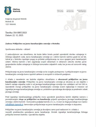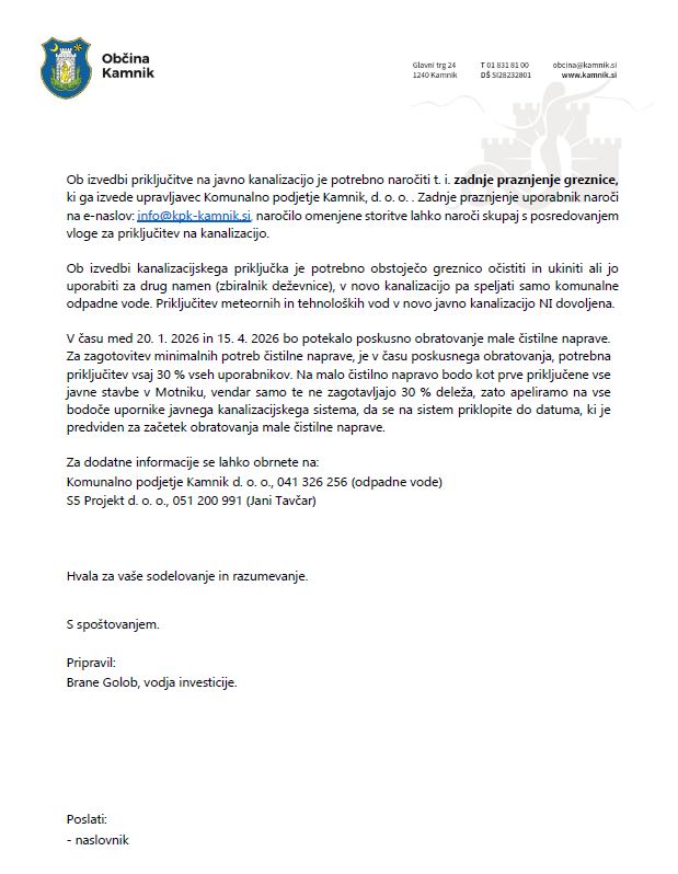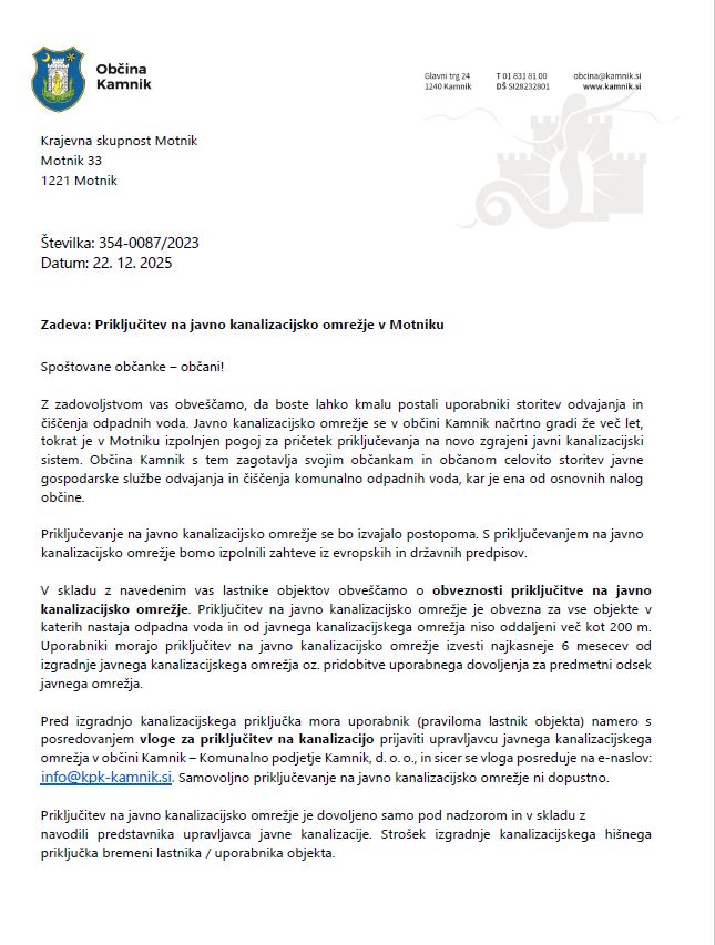 Z zadovoljstvom vas obveščamo, da boste lahko kmalu postali uporabniki storitev odvajanja in čiščenja odpadnih voda. Javno kanalizacijsko omrežje se v občini Kamnik načrtno gradi že več let, tokrat je v Motniku izpolnjen pogoj za pričetek priključevanja na novo zgrajeni javni kanalizacijski