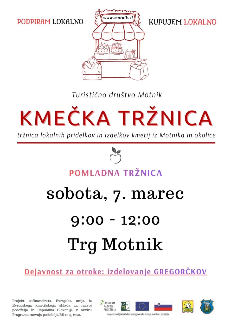 Turistično društvo Motnik vabi na pomladno Kmečko tržnico, kjer boste lahko podprli lokalne pridelovalce in kupili kakovostne domače izdelke iz Motnika in okolice. 🌱🍎 Tržnica bo potekala v soboto, 7. marca, med 9.00 in 12.00 na prireditvenem prostoru v Motniku. Obiskovalci boste lahko izbirali med različnimi lokalnimi pridelki in izdelki, ki jih pripravljajo domače kmetije…