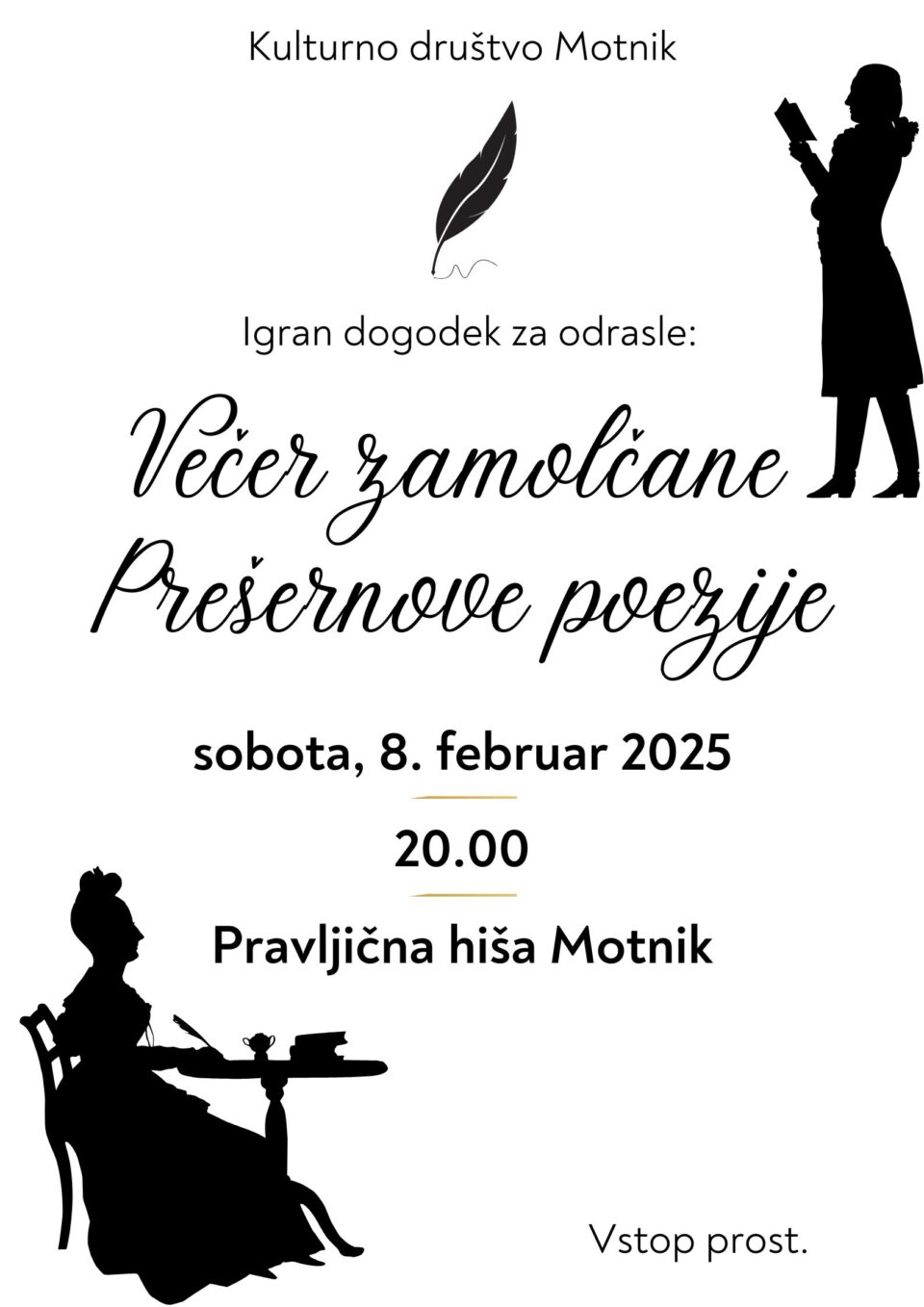 VEČER ZAMOLČANE PREŠERNOVE POEZIJE V MOTNIKU Ob Prešernovem dnevu vas vabimo na prav poseben kulturni dogodek – Večer zamolčane Prešernove poezije, ki bo v soboto, 8. februarja 2025, ob 20. uri v Pravljični hiši Motnik. Gre za igrani večer, namenjen odraslim, kjer bomo skozi interpretacije in uprizoritve obudili manj znane, a izjemno pomenljive verze Franceta…