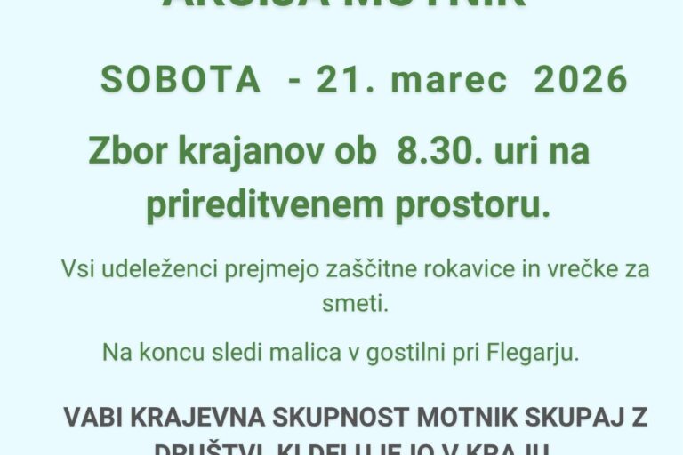 Krajevna skupnost Motnik v sodelovanju z lokalnimi društvi vabi vse krajanke in krajane, da se nam pridružite na tradicionalni čistilni akciji. Kdaj?Sobota, 21. marec 2026 ob 8.30 Kje?Zbor na prireditvenem prostoru v Motniku Skupaj bomo poskrbeli za urejeno in čisto okolje našega kraja. Za vse udeležence bodo zagotovljene zaščitne rokavice…
