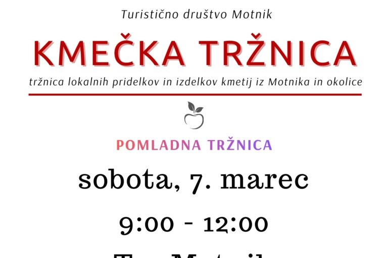Turistično društvo Motnik vabi na pomladno Kmečko tržnico, kjer boste lahko podprli lokalne pridelovalce in kupili kakovostne domače izdelke iz Motnika in okolice. 🌱🍎 Tržnica bo potekala v soboto, 7. marca, med 9.00 in 12.00 na prireditvenem prostoru v Motniku. Obiskovalci boste lahko izbirali med različnimi lokalnimi pridelki in izdelki,…