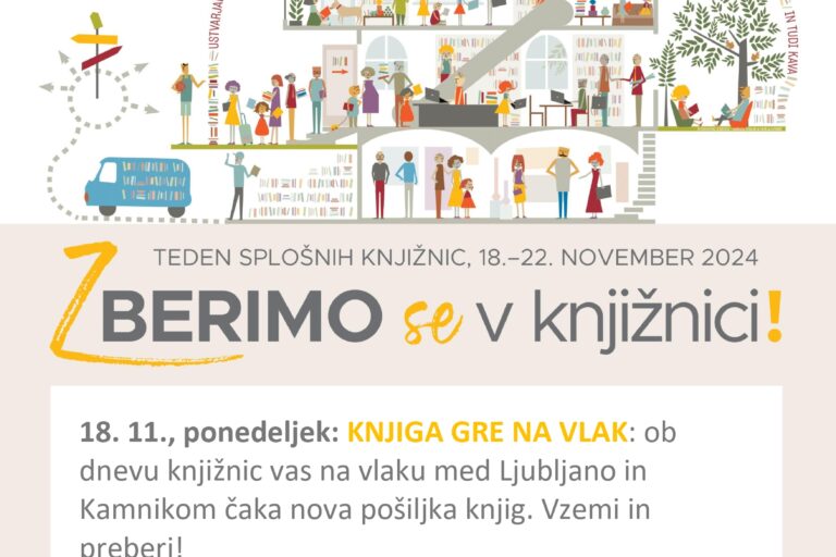 OBVESTILO V petek, 6. 12. 2024, bodo Knjižnica Franceta Balantiča Kamnik in vse njene enote zaprte zaradi strokovne ekskurzije zaposlenih. Zamudnina se za ta dan ne bo obračunala. Prosimo za razumevanje. PRAVLJIČNE URE SO, in sicer v Pravljični hiši Motnik (Motnik 33) od 17:30 do 18:15. Vabljeni!